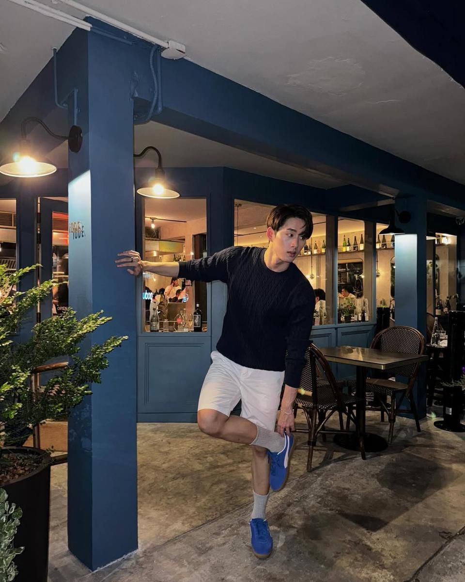 4. Kesannya preppy chic yang santai dengan sweater knit biru tua yang menyerupai gentleman pesisir, dikombinasikan dengan celana pendek putih agar terlihat rapi di musim panas, lalu sepatu sneaker biru agar terlihat menyenangkan dan muda
